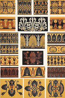 There is something strangely compelling about their red and black pottery, often populated by comely men and women up to their Attic antics –– eating, drinking and frolicking. Mr Keats was certainly captivated by their frozen beauty in his Ode to a Grecian Urn. Greek pottery decorations of this period did seem to capture life of the times more often than not, sort of proto-life-style reporting and their revelries were embellished with magnificent Greek key and palmette patterns meandering elegantly around the clay surfaces (more heroic subjects seemed to end up in marble).